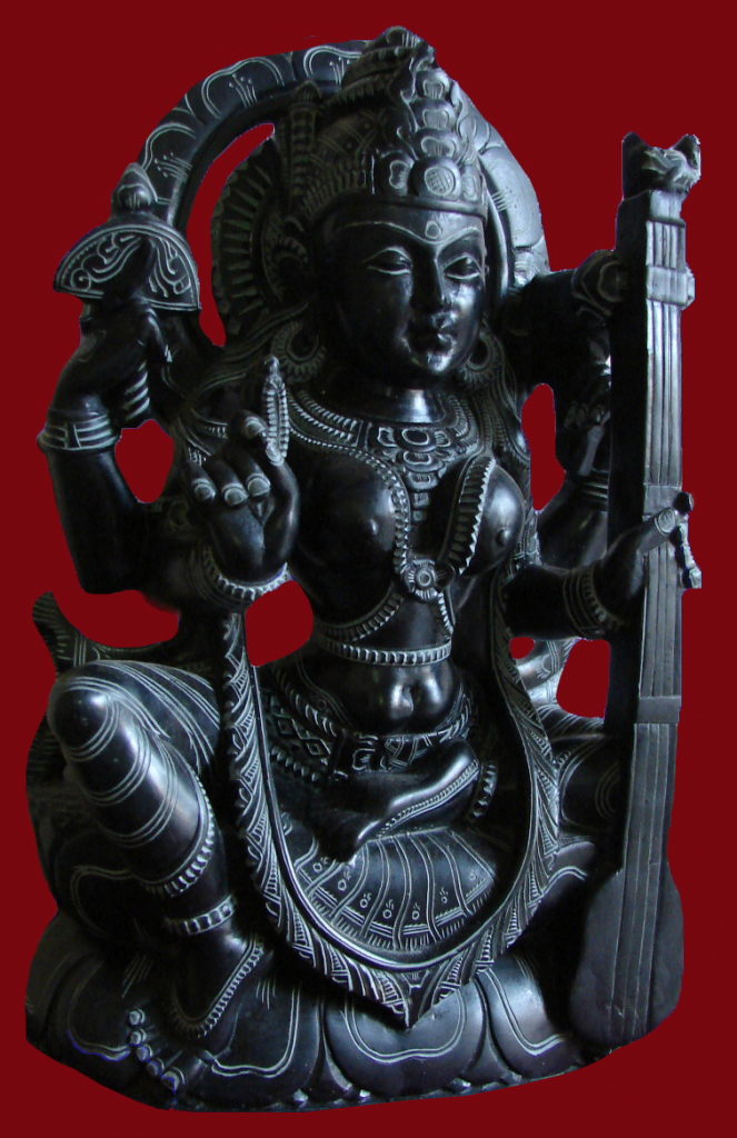 These traditional art object is called saraswati carved by hand in black stone and there are four hands and top of the both hands caught Potthi and lekhani. Third left hand hold a sittar and last right hand holding a mala and sit on lotus flower .Sara Swati is the Hindu goddess of knowledge, music, arts and science. She is a part of the trinity of Saraswati, Lakshmi and Parvati.